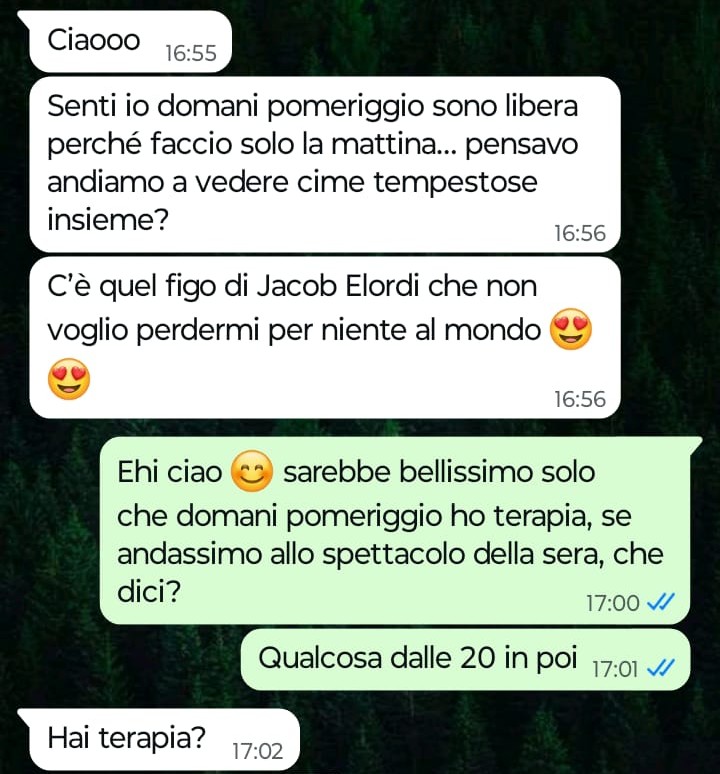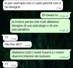 “Ciao Spunte Blu, sono sicuro che la chat che ho pensato di mandarvi oggi le batte tutte proprio, e ve lo posso garantire visto che vi seguo da sempre. Un mese fa ho conosciuto una bella ragazza e abbiamo cominciato subito a frequentarci. In questo mese ci siamo visti parecchie volte, semplicemente perché avevamo voglia di stare insieme e conoscerci sempre meglio. Devo ammettere comunque che bellezza a parte, io ho notato fin da subito che questa ragazza sembrava diciamo un po’ “strana”, però ecco all’inizio, sopratutto quando c’è di mezzo una forte attrazione fisica, uno a queste cose nemmeno ci fa caso, almeno fino a quando il disturbo di questa persona diventa così palese che appare impossibile continuare ad ignorare la cosa. Ebbene oggi pomeriggio lei mi scrive via chat per propormi di andare insieme al cinema domani, ma non appena io le rispondo che domani pomeriggio non posso per un motivo ben specifico ecco che si scatena il panico, e l’idiozia incredibile di questa ragazza esplode, viene tutta fuori come un fiume in piena. Insomma rendetevi conto da soli con che tipo di personaggio sono uscito per un mese intero…”