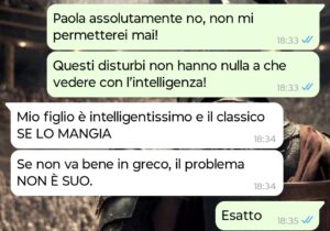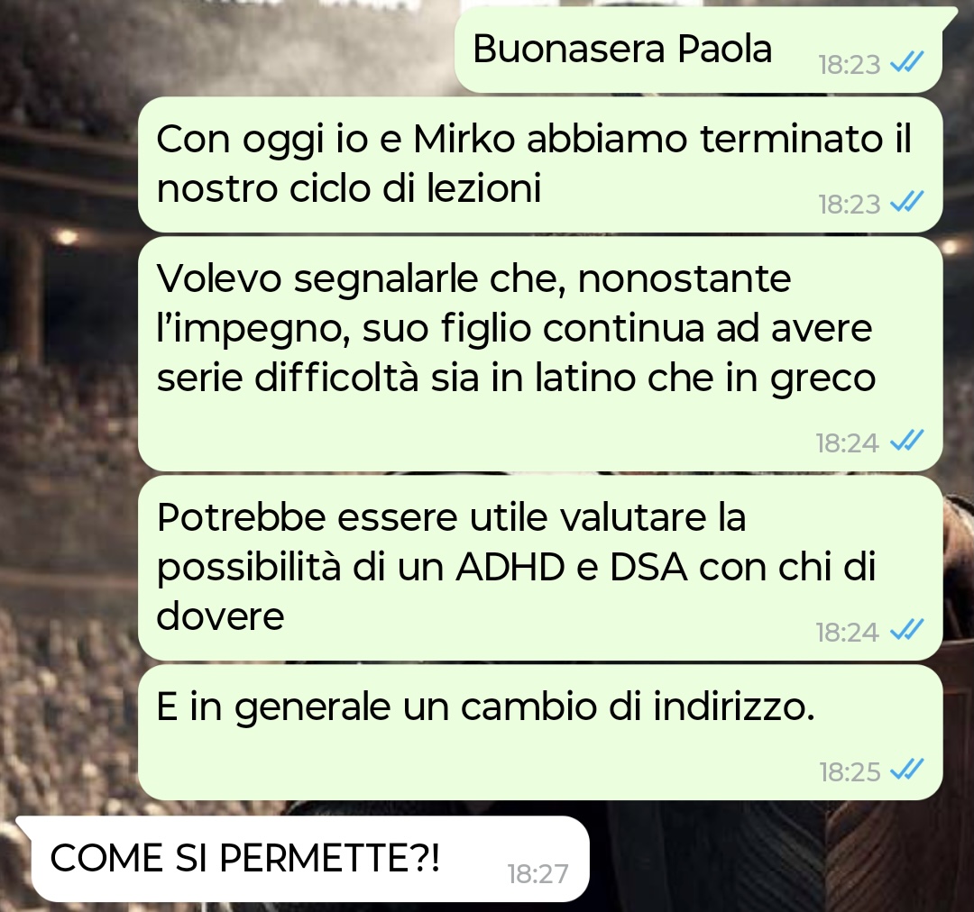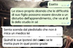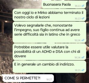 Vi mando questa chat perché, per la prima volta in assoluto, mi sono sentito mancare di rispetto da un genitore di un mio allievo. Il ragazzo in questione, Mirko, ha presentato sin da subito una serie di problematiche compatibili con un disturbo sia dell’attenzione che dell’apprendimento. In aggiunta Mirko non condivide la passione dei suoi genitori per le lettere classiche, dunque oltre alla fatica c’è anche la mancanza di interesse.