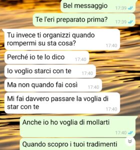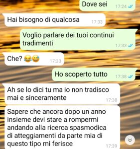 “Sono Antonietta e sono la regina dei tradimenti, nel senso che ognuna delle mie storie è finita dopo che lui mi ha tradita e anche questa volta siamo andati in quella direzione. Ovviamente questa cosa mi ha scossa parecchio e ha fatto in modo che io sia molto sospettosa di natura, non tanto gelosa perché se il mio ragazzo ha un’amicizia femminile per carità può averla, ma io sospetto molto facilmente che un tradimento sia dietro l’angolo e mi sono anche resa conto molto facilmente quando qualcuno mente e mi nasconde qualcosa. Ecco, è il caso del mio nuovo ragazzo, che nuovo non è dato che mi ci sono messa un anno fa. Fatto sta che Stefano non è un ragazzo come gli altri, anzi sembrava uno fedele e senza che facesse cose alle mie spalle, poi ho iniziato a notare qualcosa di strano e la prova definitiva è arrivata quando un giorno ho trovato per caso un sito in cui vengono inserite certe recensioni e lì ho capito che avevo la prova della sua colpevolezza. Ovviamente è stato il momento di affrontarlo, perché avevo bisogno di capire il perché.”