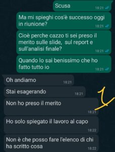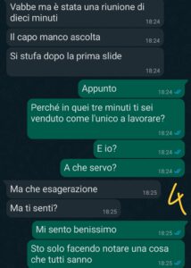 Questa chat è nata da un fastidio che ho provato durante una riunione, ma che in realtà covavo da tempo. Mi sono stufato di vedere gente che si prende meriti, mentre io resto lì a farmi andare bene tutto. Quello che non mi aspettavo, però, è che dietro ci fosse dell’altro. Che a mettermi in ombra non fosse solo il mio collega, ma anche qualcun altro.