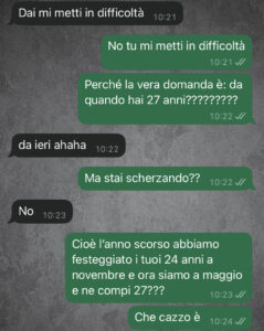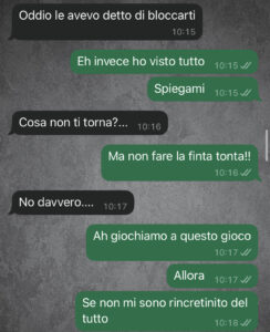 Questa è la nostra conversazione. Che faccio?? Sono confuso perché lei sminuisce, ma per me quello che ha fatto è molto grave!! Soprattutto conoscendo il mio passato.”