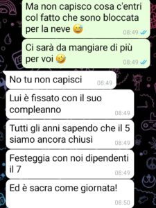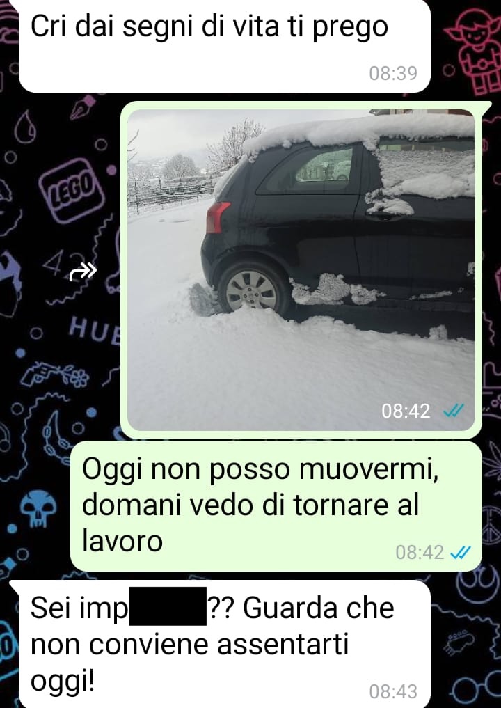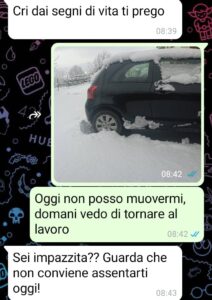 “Ciao a tutti, mi chiamo Cristina e credo di aver avuto la conversazione più assurda della mia vita. Mezza italia si è svegliata sotto la neve il 6 gennaio. Dove abito io ha continuato a nevicare anche tutta la notte tra 6 e 7 e, chiaramente, il 7 mattina non sono riuscita a muovermi per tornare a lavorare dopo la chiusura natalizia.
