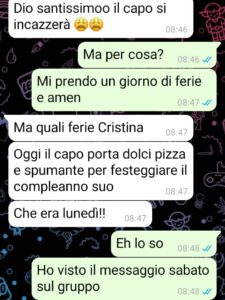Non vedendomi arrivare, mi ha scritto per sapere se stessi bene (PENSAVO). Appena le ho detto che non sarei venuta a lavorare, si è agitata da matti. Quando ho scoperto il vero problema, ho cominciato a chiedermi se davvero in italia sia normale accettare queste situazioni nei posti di lavoro. Non vi rendete conto che se i datori di lavoro si comportano così, è perché i dipendenti sono i primi a permetterglielo, mettendo l’amor proprio sotto le scarpe?”