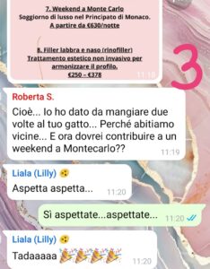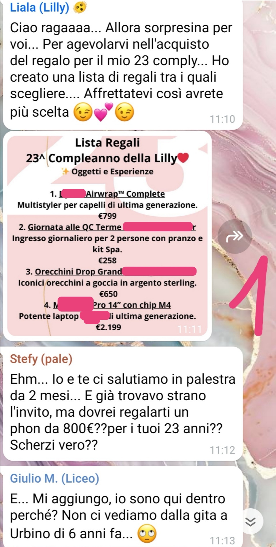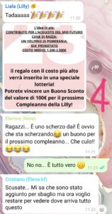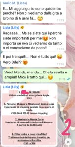 “L’altro giorno vi ho inviato la chat con l’assurda lista della mia ‘amica’ Lilly, che per il suo 23esimo compleanno (e sottolineo 23!!) ha ben pensato di creare una lista con una serie di regali con costo da capogiro! Inizialmente l’aveva mandata solo a me con lo scopo preciso di farmi scegliere in anteprima(che dolce!). Ma quando ho capito che non coglieva il mio disappunto le ho detto che avrebbe dovuto condividere l’idea geniale con il resto del gruppo. Non volevo essere l’unica ad avere l’onore.
