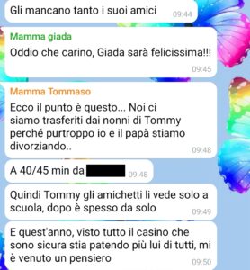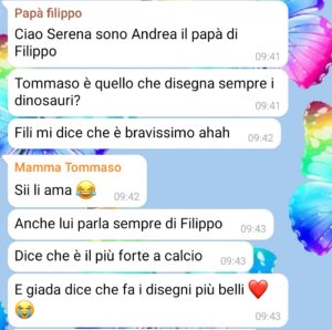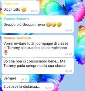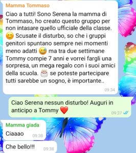 C’era un invito semplice, senza fronzoli, ma soprattutto c’era una richiesta che spiazzava: niente regali. E mentre leggevo mi sono resa conto che a volte i bambini hanno bisogni enormi espressi in cose piccolissime: una risata condivisa, un pomeriggio insieme, la sensazione di appartenere a un gruppo anche fuori dalla scuola. Questa chat mi ha ricordato che l’amicizia non è un concetto astratto: è presenza, è scegliere di esserci. E che quando una classe si muove come un’unica cosa, succede qualcosa di potente. Vi lascio la conversazione: a me ha fatto venire voglia di stringere più forte la mano di mio figlio.”