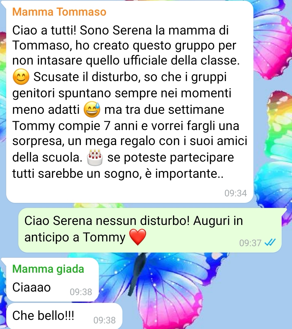 “Ciao SpunteBlu, vi scrivo da “mamma invitata” a una festa di compleanno che, almeno all’inizio, sembrava una delle solite: un gruppo WhatsApp, qualche messaggio di rito, le solite domande su orari e indirizzo. Solo che questa volta, fin dalle prime righe, ho capito che non sarebbe stata una chat qualunque. A scrivere era Serena, la mamma di un compagno di classe di mio figlio, e tra un’emoticon e l’altra si percepiva un’emozione vera, fragile, di quelle che non ti aspetti nei gruppi genitori dove di solito si parla solo di merende e compiti.
