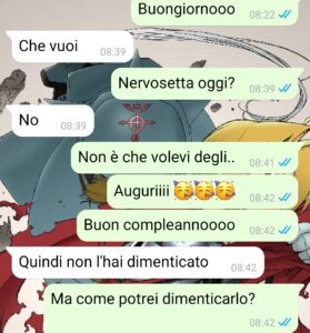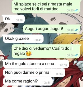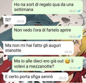 Aveva tutte delle sue teorie sulla fortuna e la sfortuna, sui tarocchi, le stelle, gli astri e cose del genere. Massimo rispetto per chi crede in queste cose, come ne avevo per lei, ma non quando queste credenze diventando così pesanti da portarsi via tutto il resto, rispetto nei miei di confronti compreso. Ed ecco che dopo meno di un anno a starci insieme, quasi uno in effetti, arriva il momento del suo compleanno, ma secondo lei faccio tutto sbagliato, fino all’offesa definitiva che l’ha portata a comportarsi malissimo con me.”
