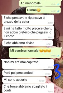 “Ciao Spunteblu, buongiorno. Mi chiamo Michela, ho 32 anni e sono single da cinque. Sicuramente sì, se sono single da tanto tempo sarà pure colpa mia, ma vi posso assicurare che ogni volta che mi sembra di aver trovato una persona normale, carina, con la quale potenzialmente costruire una relazione seria, succede qualcosa che smonta tutto. Il motivo per cui vi sto scrivendo è proprio questo, ieri sera sono stata al primo appuntamento con un ragazzo di cui preferisco non fare il nome, che aveva tutte le caratteristiche di una persona seria, normale, affidabile. Chiaramente al primo appuntamento è difficile valutare, ma la serata con lui è stata veramente piacevole, come non mi capitava da tempo. Siamo andati al ristorante e poi a fare una lunga passeggiata, abbiamo parlato molto, ci siamo confrontati su tante cose ed è stato bello. Sono tornata a casa entusiasta, non riuscivo davvero a tenere “i piedi per terra”, perché rispetto alle persone che avevo conosciuto negli ultimi anni lui era diverso. Solo che ho festeggiato troppo presto. Forse dopo aver letto questa conversazione penserete che sono stata severa. Il problema non sono i soldi, il problema è un ragazzo che mette da parte tutte le emozioni per sollevare un problema del genere. Purtroppo in quel momento lui ha già detto molto del suo carattere. Mi sono immaginata in una relazione con un tipo del genere e io, che sono una persona di cuore, non potevo sopportare. Trattasi quindi del caso umano numero 284483920. Avanti il prossimo.”
