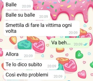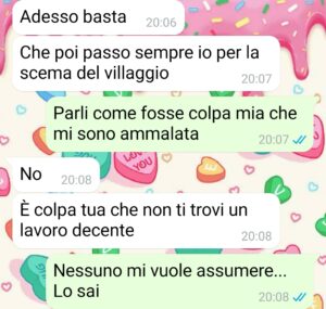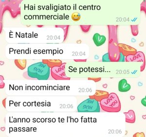 “Sono Martina, mamma di due bimbi e compagna di Marco, un sant’uomo. Questo è il secondo anno che ormai non sento più l’aria natalizia come una volta e i motivi li scoprirete presto… Ma la cosa che più mi addolora è il senso di impotenza che mi perseguita, durante l’anno è leggermente più sopportabile, ma sotto Natale no. Vorrei viverla come una volta, 3 anni fa, con la gioia di uscire a fare i regali per i miei cari, scegliere con cura i giochi da prendere ai miei bimbi e al mio compagno, la gioia di vederli scartare il tutto, la gioia del pranzo di Natale in famiglia, in cui c’è tanto caos, ma tanta allegria, anche nelle classiche litigate d’obbligo che nascono durante le feste. Ricordo tutto questo con malinconia, perché ora mi rimane soltanto l’amarezza… e mia sorella non fa altro che ricordarmi quanto io sia diventata un peso per tutti, quanto io sia inadeguata. A cominciare dai regali che faccio che secondo lei sono “imbarazzanti”…