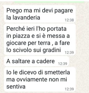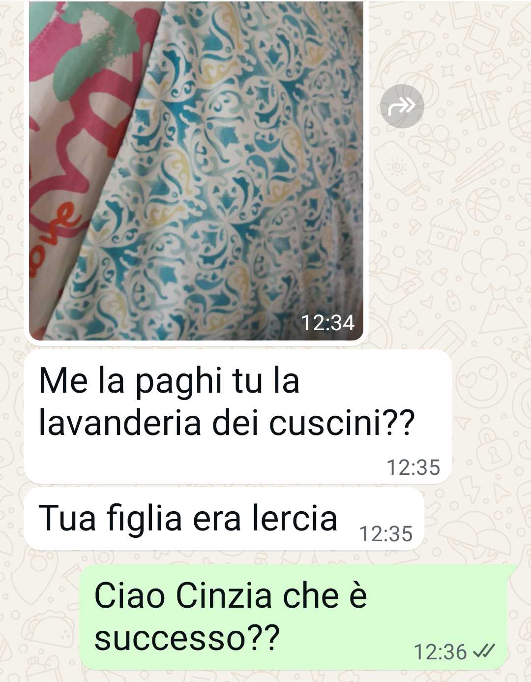 e quella mi chiede i soldi della lavanderia per lavare due schi** di cuscini?? Problema suo e non di mia figlia che è solo una bambina. Ora che fa?’ devo venire a spicciarti casa?? Devo chiamare l’impresa di pulizie per pulirle tutta la casa??? Non posso dirle sì o do il via ad altre follie e ad altre concessioni.