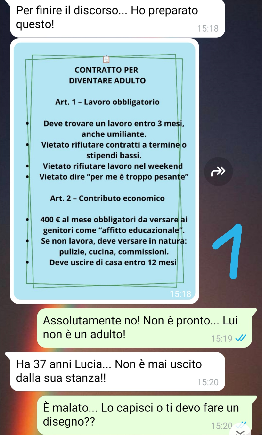 Quindi io ho un approccio con mio figlio e mio marito un altro. Ma il vero problema è che mio marito ultimamente si è impuntato su una cosa e non demorde. Sono giorni che mi sfinisce parlandomi di questa cosa e l’altro giorno per concludere già giornate estenuanti, mi ha mandato una cosa che secondo lui è l’unico modo per risolvere. Purtroppo lui non tiene conto di un fattore importante, che spesso nella nostra società viene sottovalutato.