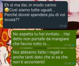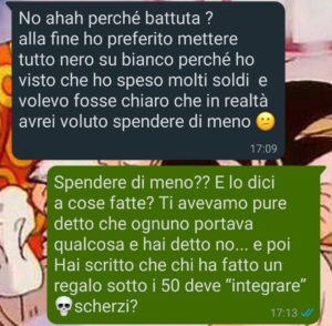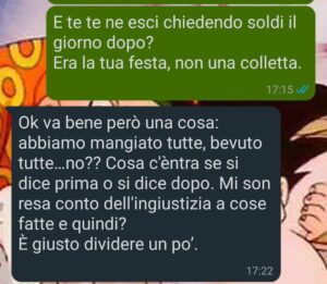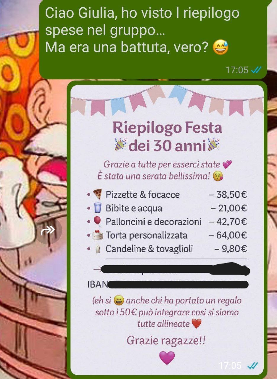 Poi, il giorno dopo, sul gruppo WhatsApp arriva un’immagine in stile Excel: “Riepilogo spese compleanno Giulia ”.