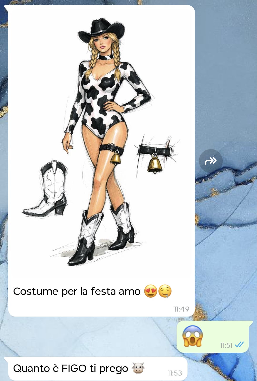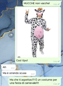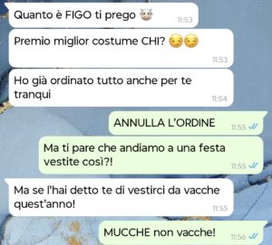 Qual è stata la sua genialata? Ha ordinato dei vestiti per una festa di carnevale a cui dovevamo andare insieme che sono praticamente dei costumi da bagno… perché secondo lei quello che mi manca è un po’ di audacia, osare di più. Lì mi sono sentita completamente inascoltata… ed è andata di male in peggio.