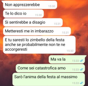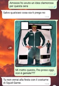 “Ciao ragazzi, io sono Salvo, vi scrivo perché secondo me la mia ragazza ha reagito malissimo a una cosa che, boh, a me sembrava semplicemente simpatica. Dovevamo andare al compleanno di una sua amica sudcoreana, Jiwoo, e io ho pensato: “Perché non vado vestito da Squid Game? È un omaggio, no?” Invece è scoppiato un mezzo dramma. Angelica non l’ha presa bene per nulla, magari è dovuto anche al fatto che ho fatto qualche gaffe in passato, tipo il karaoke, la maglietta di Breaking Bad al battesimo, le battute con il padre, anche se secondo me son tutte situazioni simpatiche dove farsi una risata, ma non pensavo di meritarmi tutto quell’odio solo per una tuta bianca e verde. Comunque, vi mando gli screen. Giudicate voi se ho davvero passato il limite o se lei esagera. Comunque alla festa poi mi son comportato bene eh, sono andato vestito normale, come voleva Angelica, ho fatto giusto qualche battutina che mi ha fatto meritare delle occhiatacce ma nulla di più, quindi secondo voi è lei che esagera o sono io che sono un pessimo fidanzato?”