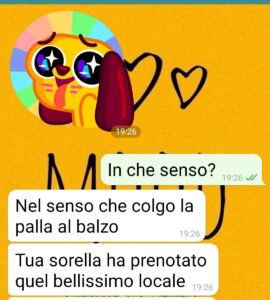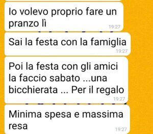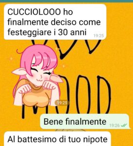 Non so se sto sbagliato o se ho sbagliato nella chat, ma mi è salito il Grinch. Mi sono sentito velenoso… cioè un senso di impunità e di cattiveria superficiale senza limite. Mi sento una me** però, cioè lei fa 30 anni. Però è veramente pazza… cioè immaginate di pagare tutto voi e poi uno durante il vostro matrimonio (o battesimo o qualsiasi altra festa) quella tira fuori la sua torta e dice “ora l’attenzione a me che faccio il compleanno”