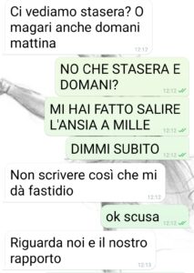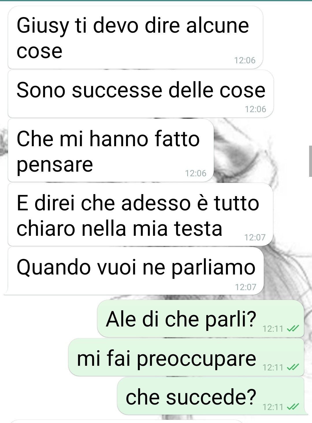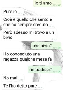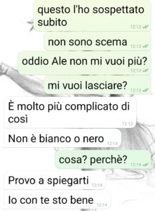 Da Giusy un saluto a tutti gli amici e amiche di spunte. Che altro vi posso dire? Se sono qua è perché qualcosa di inaspettato e spiacevole mi è successo. La chat è tra me ei mio fidanzato, Alessandro. Ci siamo conosciuti un anno fa, e siamo diventati una coppia senza rendercene quasi conto. Tutto con naturalezza e trasporto. Non ho infatti una data di “inizio relazione”. Tutto fantastico. Almeno così credevo. Anche il suo primo compleanno insieme, appena domenica scorsa, era andato a meraviglia. Ma due giorni dopo se ne esce con questi discorsi. Che non riesco a leggere bene nel suo cuore. E come carico ha pure una che ci riesce benissimo. Una che ha conosciuto mesi fa. Ci ama uguale ma lei “legge” meglio. Non è abbastanza? No! Vedete un po’ da voi quale sarebbe la prova della sua tesi. Come ho fatto a sprecare un anno con questo qua?”
