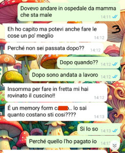 “Care SpunteBlu, mi chiamo Cinzia e in questo momento sto attraversando un periodo difficile, perché la mia mamma non sta affatto bene e entra e esce dall’ospedale. Mia mamma è anziana e malata: io so che tutto questo prima o poi la porterà a morire ma – anche se mi rendo conto è normale e naturale che una persona anziana muoia!! – devo dire che sto vivendo malissimo questa situazione.. forse in un certo senso non riesco ad accettarla. La cosa peggiore è l’atteggiamento di Ermanno il mio compagno: lui continua a viveretranquillamente la vita come se nulla fosse e non capisce perché io sia sempre giù di morale o triste.. in particolare non capisce che in questo periodo io avrei bisogno di sostegno sia emotivo che pratico da parte sua!! Io vivo, da circa un anno, a casa sua.. e a volte penso che per lui questa sia una situazione di comodo che gli permette di avere qualcuno che si occupa della casa gratis!! Eh si perché lui mi pare più interessato al fatto che i suoi calzini siano lavati e la spesa fatta piuttosto di ascoltare come mi sento io.. Tra l’altro non solo non fa nulla in casa ma non è mai contento e crea problemi in più!!! L’altro giorno ha esagerato e la mia pazienza si è esaurita…”