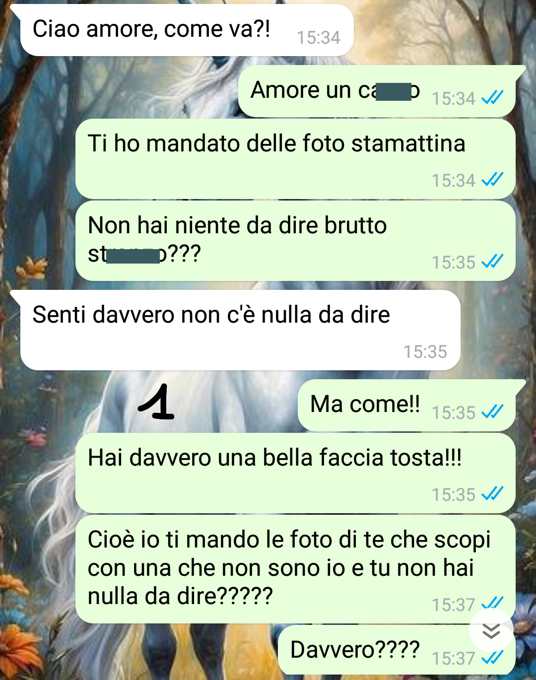 “Care SpunteBlu, vi ricordate i bei tempi quando chi tradiva aveva almeno la decenza di chiedere scusa e tirare fuori scuse tipo “lei non è nulla per me”, “io amo te” o l’intramontabile “ti prego perdonami ho sbagliato ma sono tanto pentito”?!?! Che poi ok erano perlopiù sciocchezze che chi veniva beccato tirava fuori per non venire lasciato e, soprattutto, per non dover divorziare.. cose anche dettate dal panico certo.. ma almeno ci provavano!! Cioè premiamo l’impegno, sia di recitazione che di sforzo di fantasia, per cercare di tenersi la propria moglie!! So cosa pensate: sai che sforzo, intanto le corna te le hanno messe.. e lo rifaranno!! Certo, questo è vero, ma devo dire che, adesso che le corna le ho provate anche io, posso dire che sentirsi chiedere scusa e vedere un minimo di paura negli occhi del proprio marito, non dico che consola ma un po’ fa piacere.. cioè almeno si capisce che lui ci tiene un minimo!! Perché l’alternativa è l’aria spavalda di chi sa che la farà franca senza tanto sforzo, perché è convinto che quella povera scema della moglie alla fine se lo terrà senza tante storie.. Cioè io non valgo neanche la fatica di inventarsi una scusa credibile capite!?!? Leggete cosa ho dovuto sentirmi dire quando ho scoperto che mio marito mi tradiva…”