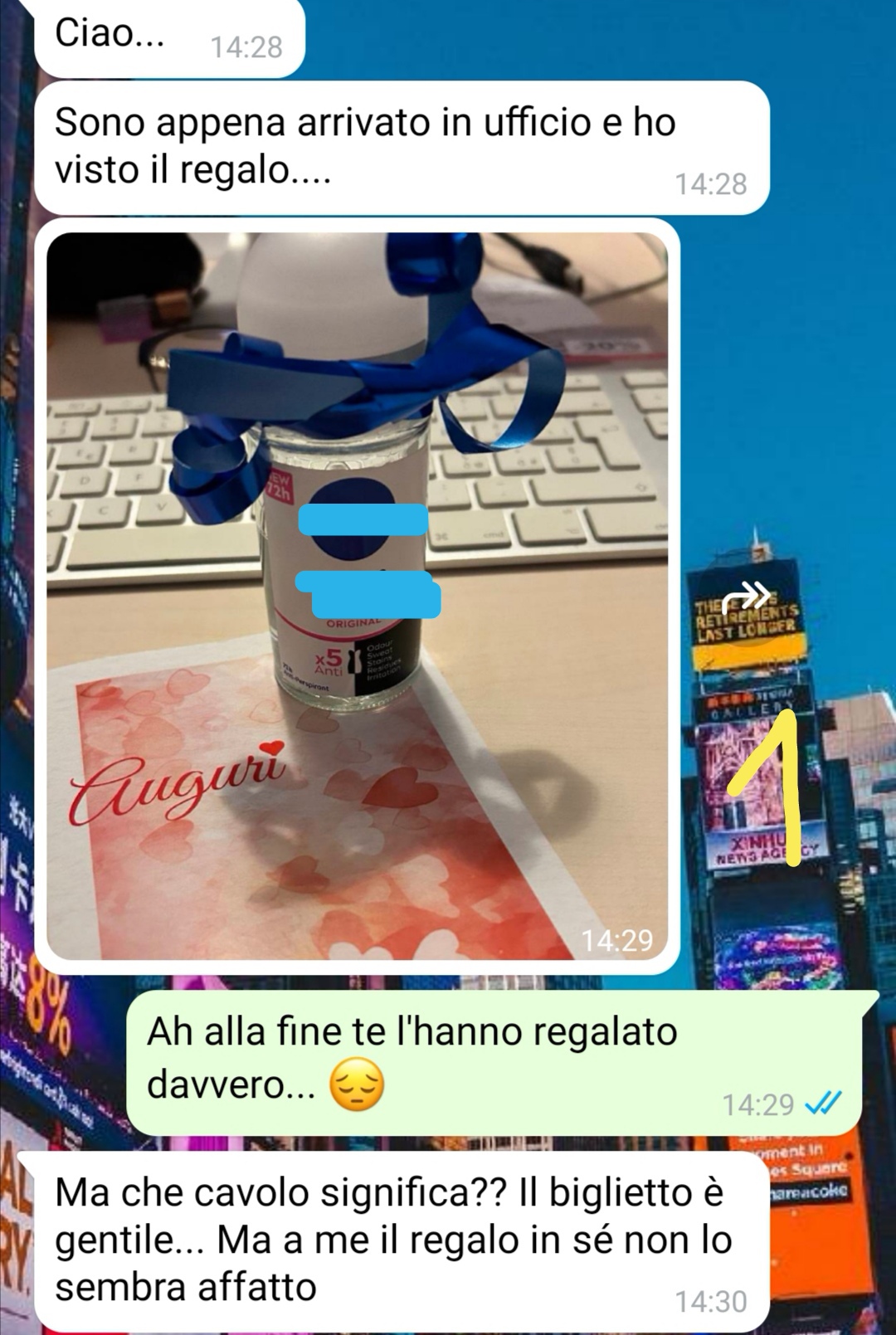 L’altro giorno si sapeva che presto sarebbe arrivato il giorno del suo compleanno, quindi alcuni colleghi hanno pensato di cogliere la palla al balzo decidendo di fare un regalo tanto utile…quanto secondo me offensivo. Cioè io sono d’accordo che è un problema ma non sono d’accordo con il mortificare le persone perché noi non possiamo sapere quale problema ci sia dietro no?