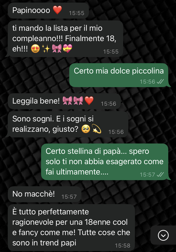 “Ciao spunteblu, sono un ricco imprenditore e ho una bellissima figlia a cui non ho mai fatto mancare niente. Forse l’ho anche un po’ viziata… perché potevo permettermelo e non me ne pento. Adesso che sta crescendo, però, sta iniziando ad avere un atteggiamento poco umile. Dice che se non le compro le cose di ultra lusso la faccio sembrare “un’operaia” (parole sue) e che si vergogna della nostra Mercedes perché la famiglia della sua migliore amica ha una Rolls Royce… E per questo non vuole più che la passi a prendere fuori da scuola. Che devo fare… Tra poco sarà il suo diciottesimo compleanno e le avevo promesso una bellissima festa per questo suo traguardo importante, ma non mi aspettavo delle simili richieste… mi sento un po’ in difficoltà. Ma forse sono solo cose che vanno di moda tra i giovani e che io non capisco…. Forse oggi il mondo funziona così e noi dobbiamo adattarci. Mi date qualche consiglio per favore? Confido anche nei vostri lettori delle nuove generazioni… vorrei trovare un compromesso per fare comunque una festa meravigliosa alla mia dolce principessa.”