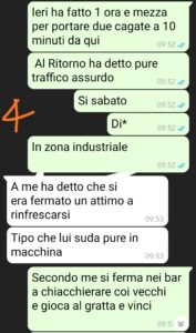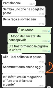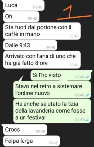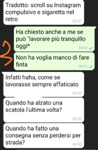 Questa è la nostra chat di una mattina normale in ufficio, mentre io ero nel retro a fare ordini e lui davanti a gestire clienti.