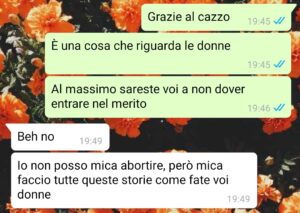 Ma poi come può un ragazzo, maschio quindi, permettersi di dire cose e mettere bocca e proferire parola su una cosa che riguarda solo ed esclusivamente le donne, con quale coraggio e con quale dose di faccia tosta ed arroganza uno si può comportare così?
