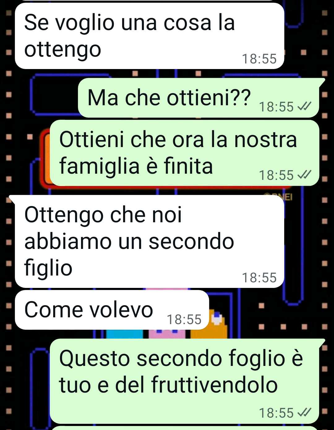 La conosco mia moglie. So che non è una donna intelligente. So che non è una cima ad arrivare alle cose. Lo so, la conosco. Ma pensavo che fosse solo un po’ sciocca, un po’ infantile. A volte mi è sembrato giocasse a essere adulta, quando invece era solo una bambina che faceva monellerie, chiedeva scusa col broncino e tutto poi tornava a posto. Ma credevo che tutto questo avesse un limite e che si rendesse conto della vita, del senso delle cose. Mi sbagliavo e di grosso!! Cioè guardate cosa fatto e guardate cosa mi ha chiesto di fare!!!