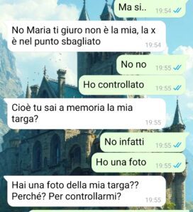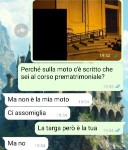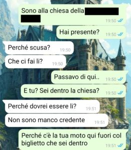 “Salve, vorrei ringraziare per darmi la possibilità di dire la mia e far capire quanto i ragazzi possano essere falsi. Non voglio che si pensi che non ci si può più fidare di nessuno, però certo ciò che mi è successo fa abbassare la stima e la fiducia nei confronti di tutti. Comunque io sono Maria, ho 28 anni e per quasi un anno sono stata con un ragazzo di cui vi prego di censurare il nome e anche il modello di moto che si vede nelle foto che ho inviato. Non perché voglia coprirlo dopo ciò che ha fatto, ma perché non voglio si pensi che io stia inviando questa chat per ripicca o per rivalsa, anzi, è più una cosa mia, catartica. In ogni caso io mi ci trovavo bene, anche perché io sono una molto indipendente e soprattutto sono una un po’ introversa, non amo uscire la sera, tipo il sabato, preferisco starmene chiusa nel mio bozzo a letto. So che non è il massimo, ma io ho questo modo di fare e voglio che il mio ragazzo sia come me. Lui era invece un po’ diverso, usciva spesso con amici, che non conoscevo comunque anche dopo tutto quel tempo, e a volte spariva per un po’ ma non mi sono mai preoccupata, non ho mai notato strani segnali. Poi un giorno vado a fare compere e passo davanti una chiesa, noto la sua moto e uno strano biglietto…”