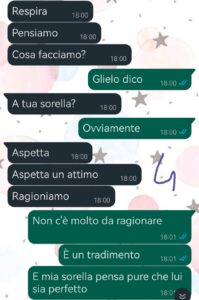 “Non è il mio compagno. E nemmeno il mio problema. Ma è il fidanzato di mia sorella. E quello che ho visto con i miei occhi non posso far finta che non sia mai successo. Lui, mano nella mano con un’altra. E poi i messaggi, le prove. Ho raccontato tutto al mio compagno, Stefano. Ma da lì… è iniziato un dilemma enorme. Glielo diciamo o no? Il mio compagno dice che non dobbiamo rovinarle la vita se non siamo sicuri. Io dico che il marcio non va nascosto sotto il tappeto. Abbiamo trovato un modo. Questa è la nostra chat. Voi che avreste fatto?”