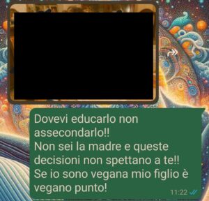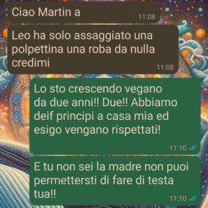 “Mi chiamo Martina, ho 33 anni e un figlio di 4, Leonardo. Da due anni è vegano: una scelta che ho fatto con consapevolezza e coerenza, seguita da un’alimentarista di fiducia che è anche mia amica. Non è stato facile, lo ammetto, ma sono convinta che crescere Leo così sia la scelta più sana e rispettosa che potessi fare. C’è chi non capisce e chi fa finta di capire, come mia suocera. Lei ci dà una mano con Leo, e con questa scusa si è presa delle libertà che non le spettano. Commenti non richiesti, consigli velati, quella classica aria da “ma cosa vuoi saperne tu che sei madre da cinque minuti”.