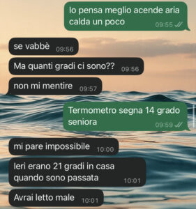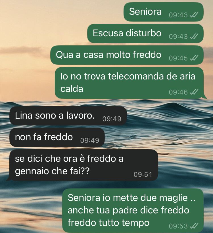 Io fa lavoro con rispetto grande, perché io pensa che persone anziane meritano calma e calore, no problemi. Ma a volte comunicazione con famiglia è dura duro, e io non sa più se io fa bene o no. Ogni volta che io prova chiedere qualcosa semplice, nasce discussione grande, e io non capisce perché. Io non vuole comandare niente, io solo vuole lavoro giusto, tranquillo.