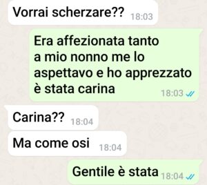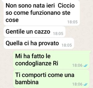 Sembra uno scherzo vero? Invece non lo è, è solo la realtà che mi sono trovato a vivere in un momento già molto doloroso. Quando è venuto a mancare mio nonno, a cui ero legatissimo, vi lascio immaginare lo stato d’animo in cui mi trovavo. Non solo io, ma tutta la mia famiglia era distrutta e in quel momento delicatissimo, invece di ricevere il supporto che mi sarei aspettato da Rita, mi sono trovato davanti a una serie di accuse assurde e gelosie totalmente fuori luogo e infondate. Invece di starmi vicino, ha iniziato a dire che la situazione era solo una scusa per attirare attenzioni, che “guarda caso” alcune persone mi scrivevano proprio in quel momento, e che dietro ogni gesto ci fosse chissà quale secondo fine. Ha trasformato un lutto in un pretesto per sfogare la sua insicurezza e la sua ossessione di controllo con sospetti, insinuazioni e pensieri malati che non avrei mai immaginato di sentire in un momento simile. Francesco.”