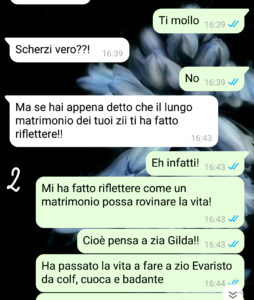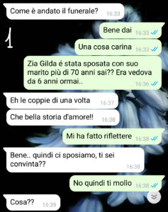 Comunque sia ora zia Gilda è morta – pace all’anima sua! – e io al suo funerale ho preso una decisione importante. Quando sono tornata a casa ho detto al mio ragazzo cosa avevo deciso e lui, inevitabilmente, non l’ha presa molto bene…”
