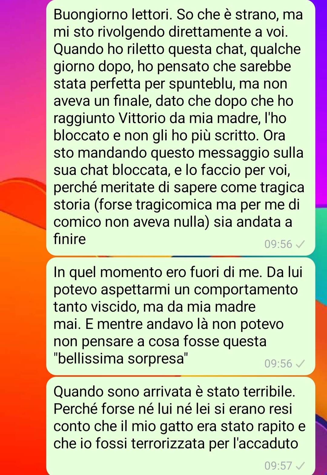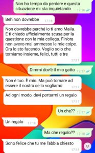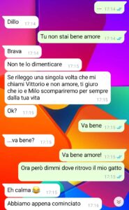 “Fino al giorno prima, la mia vita era relativamente tranquilla. Sicuramente avevo preso una decisione forte, perché lasciare Vittorio, dopo tutto quello che avevamo vissuto, non è stata una decisione presa a cuor leggero. Ma si era comportato male, e quindi era l’unica via possibile. Certo…si era comportato male, ma mai e poi mi sarei immaginata che potesse arrivare a tanto. Lui era un tranquillone, una persona magari poco affidabile ma di certo non uno che mette in atto vendette o se la prende con persone o, in questo caso, animali innocenti. Il problema è che, nel giro di qualche ora, la mia vita era cambiata e stava cambiando. Ero tornata a casa e il mio adorato Milo ero scomparso. E l’aveva preso lui, che ora mi stava miseramente ricattando. E allora che dovevo fare? Non sapevo dove fosse, non sapevo che intenzioni avesse, e soprattutto non potevo rischiare che venisse fatto qualcosa di spiacevole (di ancora più spiacevole di così) a Milo. Avevo, purtroppo, una sola possibilità: stare al gioco, rimanere lucida, e cercare di salvare il mio gatto il prima possibile.”