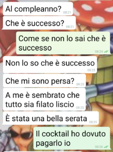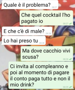 “Ho avuto un alterco con la mia fidanzata perché si ostina a difendere suo fratello. Che ha fatto una cosa davvero spiacevole e intenzionale. Il mondo non casca certo, ma io a questa gente preferisco non legarmi. Ci sto alla larga se posso, perché non sono persone che mi aggradano. Dalle piccole cose si capiscono quelle grandi. Con la mia fidanzata stiamo assieme da 8 mesi è ho avuto occasione di conoscere i suoi familiari in modo sporadico. Ma tanto è bastato perché suo fratello mi invitasse alla festa per i suoi 30 anni. Mi dicono alle 20 in tal pizzeria e puntuale mi presento. La mia fidanzata verrà con la famiglia, che il locale è “in mezzo” alle nostre abitazioni. E sono arrivati con 45 minuti di ritardo! E io solo ad aspettare al tavolo come uno scemo. Ma non è questo il problema della chat. Nell’attesa ho ordinato un moscow mule. Ed è su questo drink che nasce tutta la diatriba. Ripeto, il mondo non casca, ma ho diritto di fare le mie valutazioni. Le vostre quali sono?”