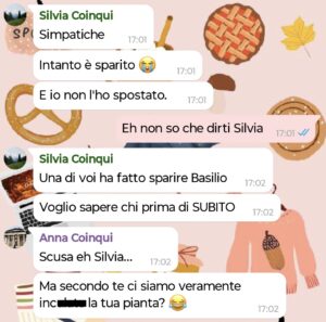 Qui abbiamo finalmente una camera singola per ciascuna e devo dire che, dopo due anni di condivisione degli spazi, non è per niente male come cosa. Solo che la casa ha tre stanze, quindi tre inquilini. Ed ecco il nostro primo, grande problema. Silvia. Anche lei studentessa fuorisede, più piccola di noi di due anni. Silvia è… particolare. Ha mille “passioni” che sfociano un po’ in fissazioni e una grande mania di persecuzione. Tra queste sue passioni c’è ovviamente quella del giardinaggio. Il punto di forza di questa casa sono i balconi e lei, da quando ci siamo trasferite qui a fine agosto, ne ha fatto il suo regno diciamo… il che va bene, cioè io uso il balcone solo raramente, ma il problema è che ad un certo punto una delle sue piante, Basilio, sparisce. Ed ecco il giallo. lei, convintissima che sia stata una di noi, parte con le accuse… non dico altro, godetevi la lettura.