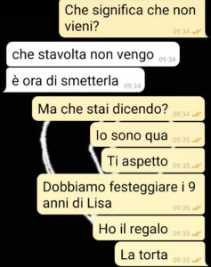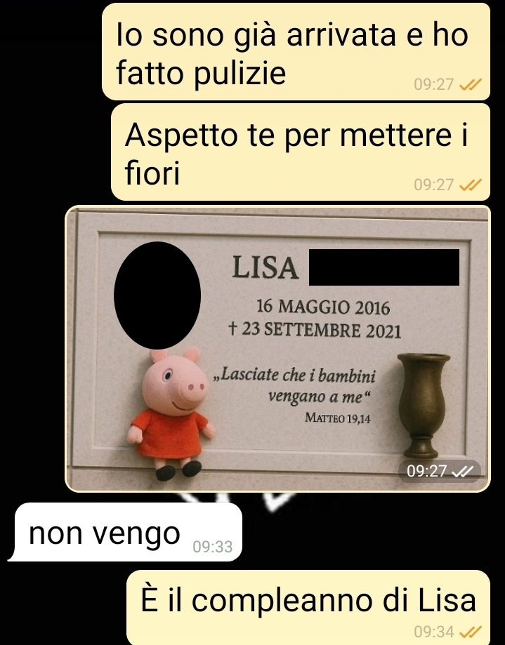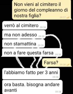 “Mio marito non vuole più partecipare al compleanno di Lisa. Non vuole più venire a festeggiare il compleanno di nostra figlia. Perché anche se è morta ormai è comunque sempre il suo compleanno. E a me questa cosa mi fa uscire di testa. Un misto tra rabbia e delusione che non so esprimere. Perché alla fine non si è visto per tutto il giorno. Io sono stata al cimitero finchè non mi hanno buttato fuori. E di lui nessuna traccia. Anche io sono andata avanti, ci provo faticosamente ogni giorno. E provo a capire cosa intende, ma non si può passare una spugna e fine problemi, tutto pulito. E non sopporto che mi deve dare la colpa perché è finita tra noi. Perché fa così? Ma anche lui non soffre a vedere me ogni giorno? Siamo dolore uno per l’altro. E dopo quello che ha osato dirmi in chat… ma può veramente essere farina del suo sacco? Per 3 anni non è stato un problema essere famiglia per un giorno. È il compleanno di Lisa porco mondo! La mia vita fa schifo già così, perché rovinare tutto?”