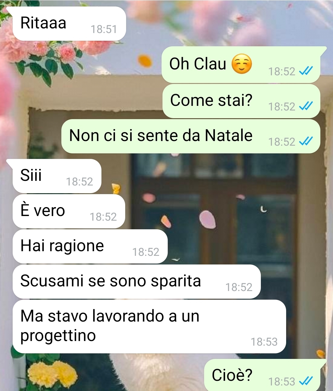 “Ciao a tutti, il mio nome è Rita e ho pensato che fosse il momento migliore per mostrare a tutti quanto un ragazzo possa essere falso e distruggere una relazione di ben 3 anni nel giro di un secondo e quanto una carissima amica possa rivelarsi ancora peggio. Vi racconto di come ho conosciuto il mio ragazzo, che io ero appena stata lasciata da uno che mi aveva tradita e che aveva preferito andare con un’altra e restarci e che mi aveva assicurato che non sarebbe mai successo con lui. Di come io e lui abbiamo iniziato a essere una coppia normale, che ha rapporti meno spesso rispetto ai primi tempi, ma va comunque bene così. Ma vi spiego anche chi sia Claudia, una che non lavora, non studia, non fa praticamente niente e che passa il suo tempo tra feste e a farsi campare dal paparino che le paga tutto. Una che sento, o sentivo, spesso e che dopo qualche settimana ha ben pensato di rifarsi viva solo per farmi incavolare come poche altre volte nella storia. E dopo avermi cercata ho capito che non dovevo fidarmi.”