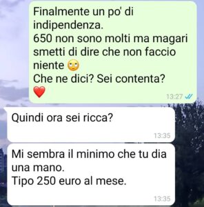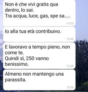Per dormire in una stanza senza termosifone e mangiare piatti riscaldati da sola, perché lei e il suo compagno mangiano a parte.