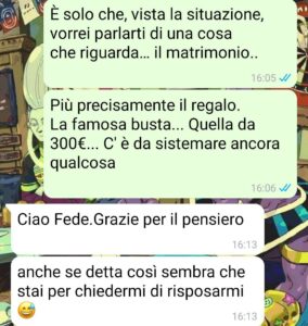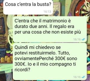 E allora mi chiedo: perché dobbiamo essere noi a perdere 300 euro per una festa che non ha portato a nulla? Perché i regali devono valere anche quando la cosa per cui sono stati fatti non esiste più?
