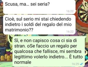 E allora mi chiedo: perché dobbiamo essere noi a perdere 300 euro per una festa che non ha portato a nulla? Perché i regali devono valere anche quando la cosa per cui sono stati fatti non esiste più?