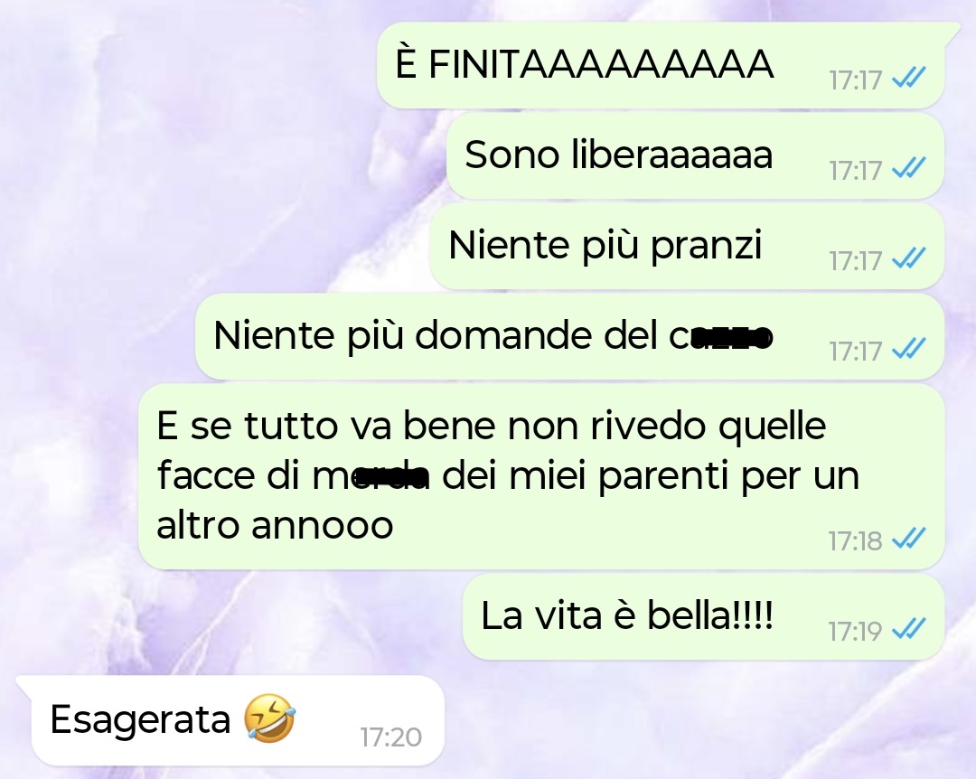 Quest’anno è stato particolarmente pesante perché ho fatto la doppietta: sono andata anche al pranzo del 26 dalla famiglia del mio ragazzo, che probabilmente andrebbe molto d’accordo con la mia perché sono tutti ugualmente sgradevoli.