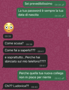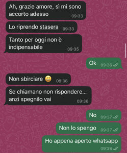 Praticamente ha lasciato il telefono di lavoro a casa per sbaglio e io ho sbirciato… lo so che non si fa, ma menomale che l’ho fatto.