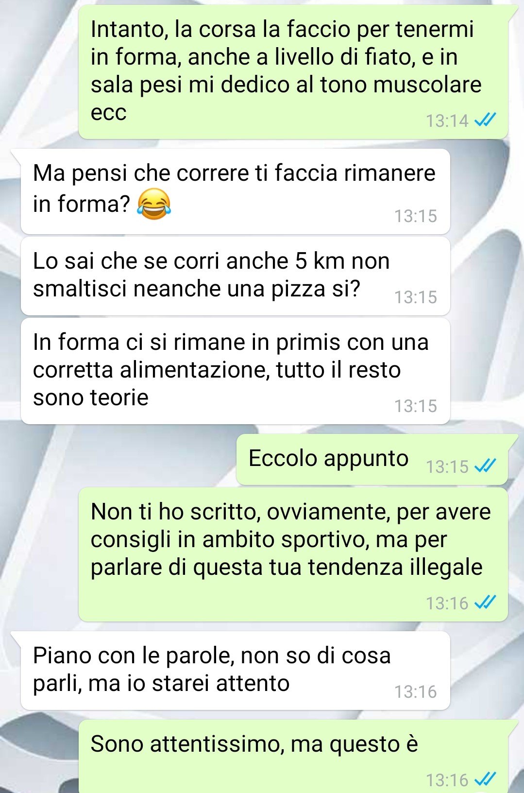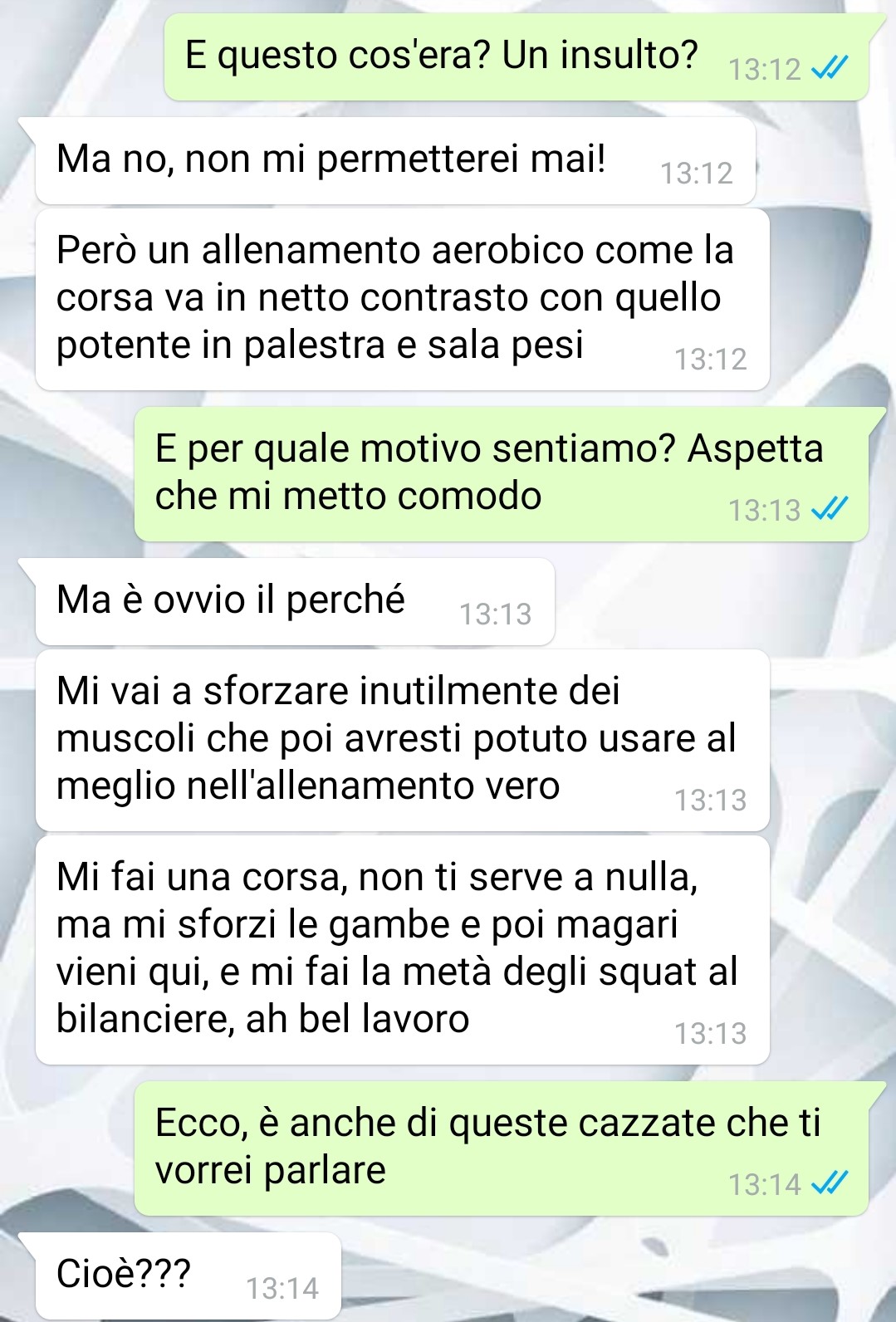 “Non ho perso tempo ed immediatamente dopo aver chiuso la conversazione con mio fratello, tempo qualche minuto per trovare il contatto, ho scritto a Francesco, il personal trainer che lo segue, per capire effettivamente che tipo fosse e per cercare di farlo ragionare in merito al suo comportamento.