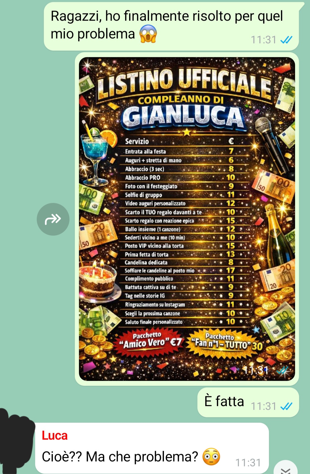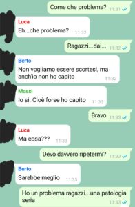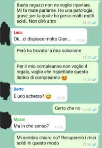 “Sono qui a scrivervi la mia storia perché sento che parlarne aiuta, anche se lo pensavo anche prima di questa conversazione. Pensavo che l’aprirmi con i miei “amici” mia potesse aiutare ad affrontare la situazione. Soprattutto pensavo che il farlo giocosamente e simpaticamente avrebbe aiuto. Ma a volte non tutto va come sembra. Non voglio entrare troppo nel dettaglio ma da alcuni mesi, forse quasi un anno in realtà, non lo so bene, soffro di una grave patologia. Una patologia che purtroppo, come spesso accade quando si parla di qualcosa che non si conosce, viene sottovalutata, e questo è motivo di sofferenza, soprattutto per chi ne vive le conseguenze ogni giorno. Questa malattia, per ovvie ragioni, mi ha tolto tantissimo tempo ma anche e soprattutto tanto, ma tanto denaro. Si stava avvicinando il mio compleanno e a causa di tutti i soldi che avevo speso per questa patologia, necessariamente non potevo permettermi una festa di compleanno tradizionale. Allora ho avuto questa grande idea, simpatica, giocosa, divertente, e l’ho proposta a quelli che credevo essere i miei amici più stretti.”