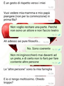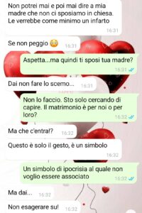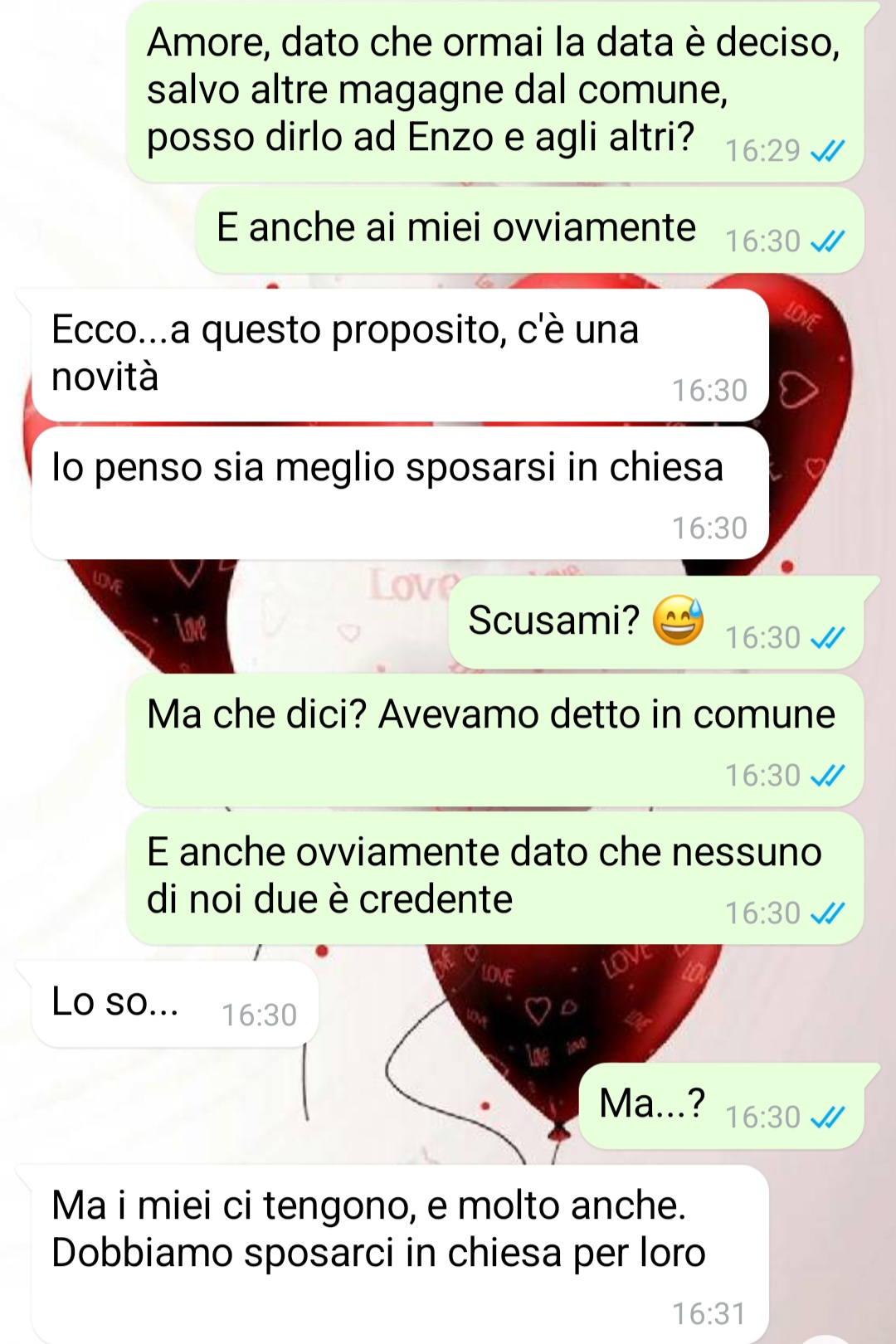 “Non pensavo che sposarsi potesse diventare una guerra “santa”. Io e Chiara stiamo insieme da anni, conviviamo da due, e non abbiamo mai litigato seriamente. Poi è arrivato il momento di decidere dove sposarci… e da lì, il delirio. Io non credo in dio, anzi, diciamo pure che con la Chiesa non vado proprio d’accordo. Lei invece non è praticante, ma viene da una famiglia cattolicissima. E finché si trattava di fare il presepe o benedire la casa, ok, mi stava anche bene. Ma quando ha detto che voleva sposarsi in Chiesa “per non far soffrire i suoi genitori”, mi si è accesa la spia rossa. Io credo che le scelte vadano fatte con sincerità, non per forma. Lo so che la vita è fatta di compromessi, e so anche che nelle relazioni non può andare tutto come si vuole, ma vedrete, sono stati fatti dei gravi colpi bassi nei miei confronti e io non ci sto. Chi l’ha detto che deve sempre essere l’uomo a fare un passo indietro? Sono stato trattato male, sono stato messo alle strette, io non lo accetto. Stava andando tutto relativamente, pensavo di aver già chiuso la questione, poi c’è stata questa conversazione.”