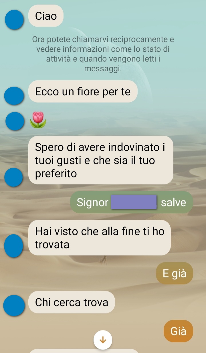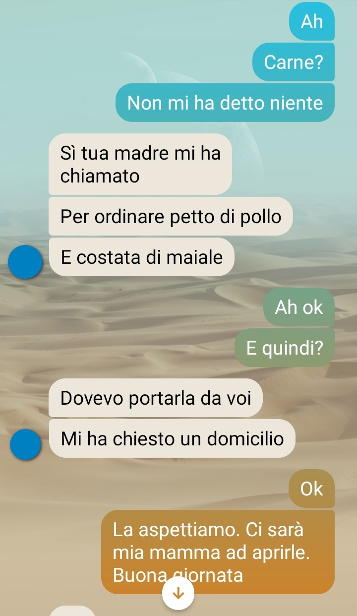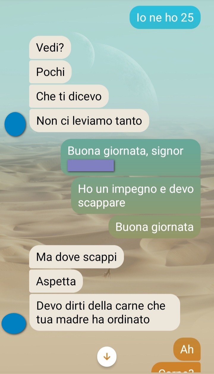 “Appena ho concluso questa chat ho subito pensato a voi. Chissà quante gliene diranno al povero Signor *****. Dovete sapere che è il macellaio di fiducia della mia famiglia. Mia mamma si trova bene con lui, ha ottimi prezzi in effetti e la carne è buona.