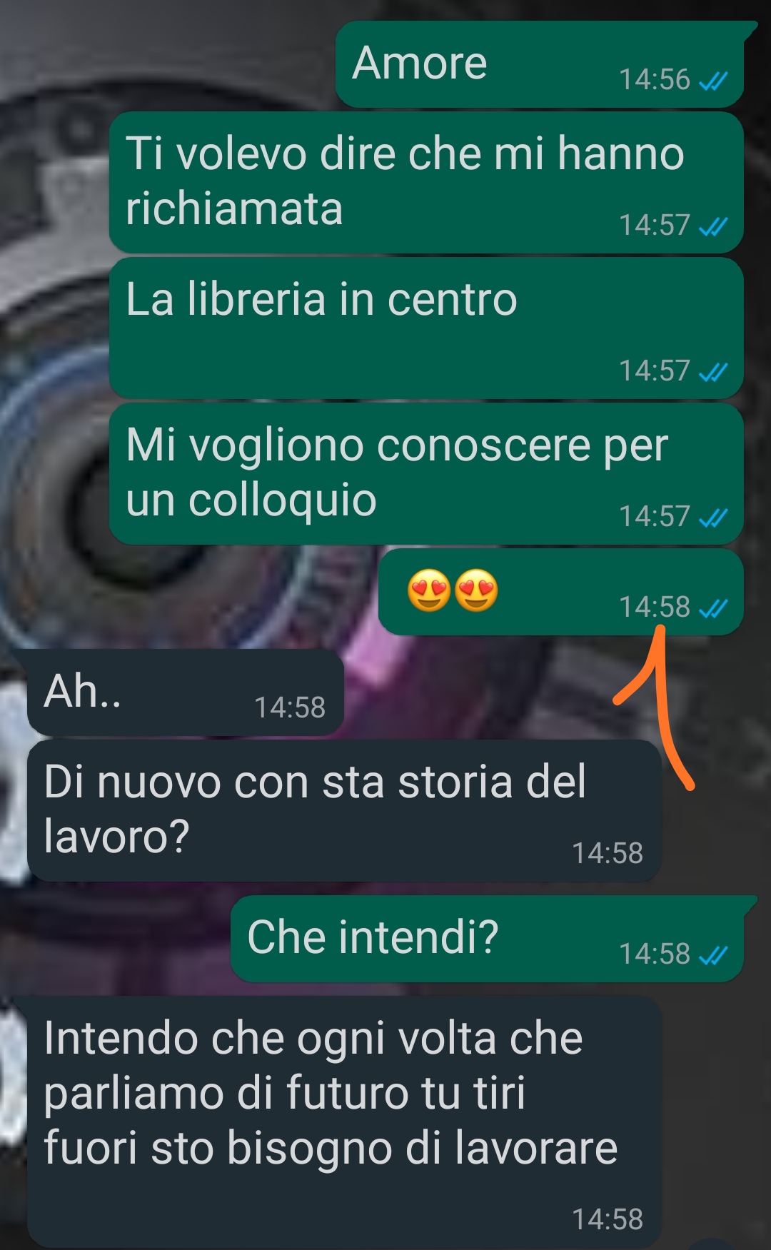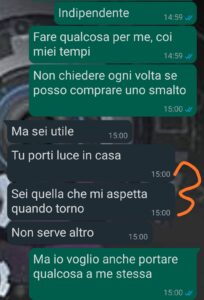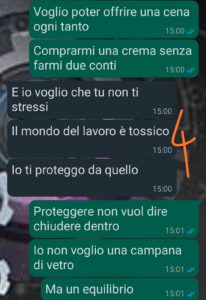 “Non tutte le gabbie hanno le sbarre. A volte sembrano coccole, parole dolci, attenzioni. Io e Tommaso stiamo insieme da quasi due anni. All’inizio mi diceva che ero “preziosa” e che non dovevo “stancarmi per lavorare”. Che mi avrebbe sempre protetta, mantenuta, sostenuta. Sembrava amore. E invece era controllo. Solo che non te ne accorgi subito. All’inizio ti senti speciale. Poi inizi a chiederti perché ti senti in colpa quando parli di CV, colloqui o autonomia. Vi lascio la nostra chat. Perché a volte le prigioni più strette sono fatte di zucchero.”