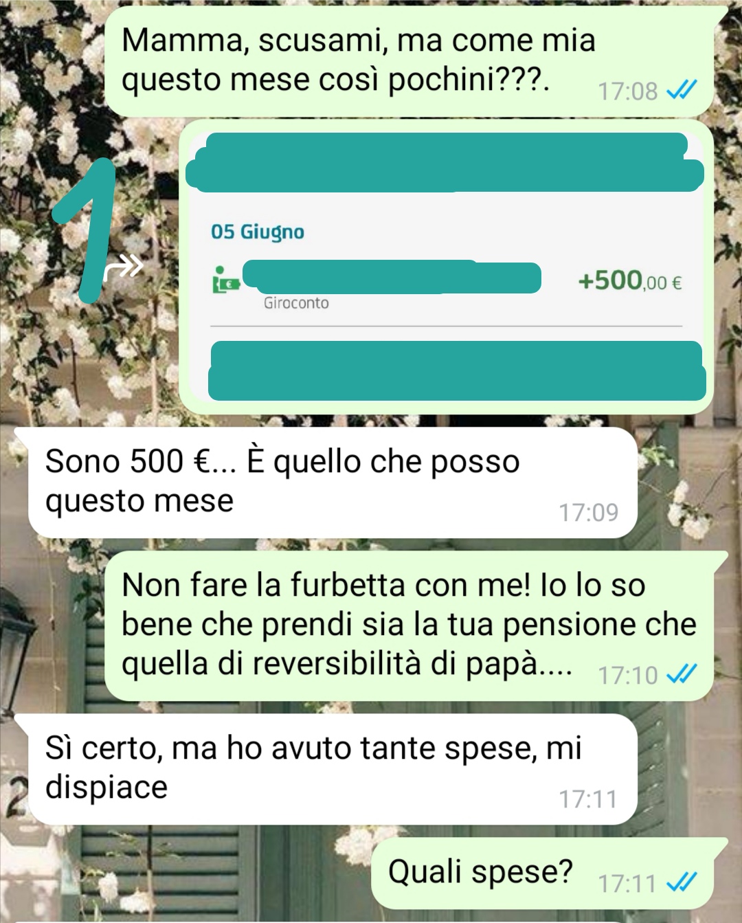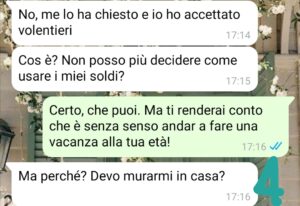 Così prima decido di chiederglielo con gentilezza, poi la incalzo per scoprire i motivi. E guardate cosa viene fuori… io sono scioccata. Cioè non posso credere che mia madre stia facendo davvero una cosa del genere! Ma non mi fermo qui. So che esiste una legge che mi tutela…qualcuno ha esperienze in merito e può darmi consigli su come procedere??”