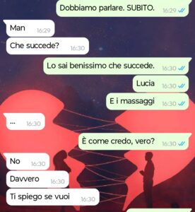 “Mi sono sempre ritenuto una persona ragionevole e nonostante dentro avessi voglia di rompere qualcosa, ho deciso di accertarmi prima se i miei sospetti erano fondati. Dovevo parlare anche con Marco, il mio amico. Anzi, quello che consideravo amico.